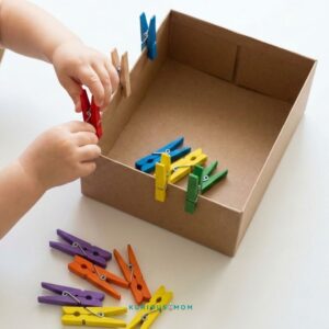 Ask your toddler to clip colorful clothespins onto the edges of a cardboard box.