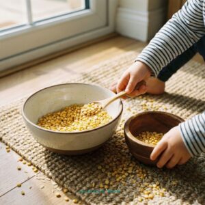 Let your toddler scoop rice or dal from one bowl to another using a spoon.